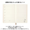 ページを開くと、左に見開き一週間のスケジュール、右は自分が使える横罫ノートになっています。一番下の土日はハーフサイズなので平日のお仕事や学校の予定の書き込みに向いています。