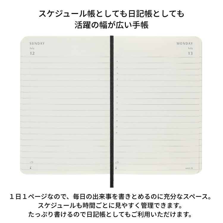 1日1ページなので、毎日の出来事を書きとめるのに充分なスペース。スケジュールも時間ごとに見やすく管理できます。たっぷり書けるので日記帳としてもご利用いただけます。