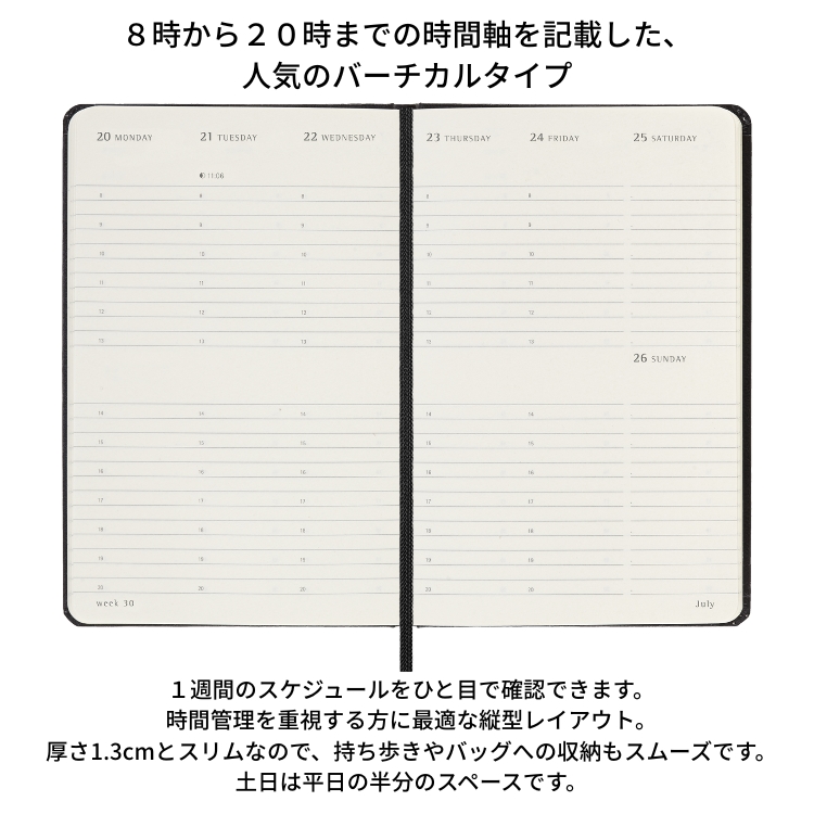 1週間のスケジュールをひと目で確認できます。時間管理を重視する方に最適な縦型レイアウト。厚さ1.3cmとスリムなので、持ち歩きやバッグへの収納もスムーズです。土日は平日の半分のスペースです。