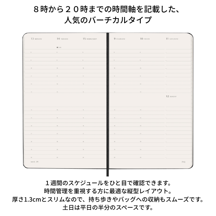 1週間のスケジュールをひと目で確認できます。時間管理を重視する方に最適な縦型レイアウト。厚さ1.3cmとスリムなので、持ち歩きやバッグへの収納もスムーズです。土日は平日の半分のスペースです。