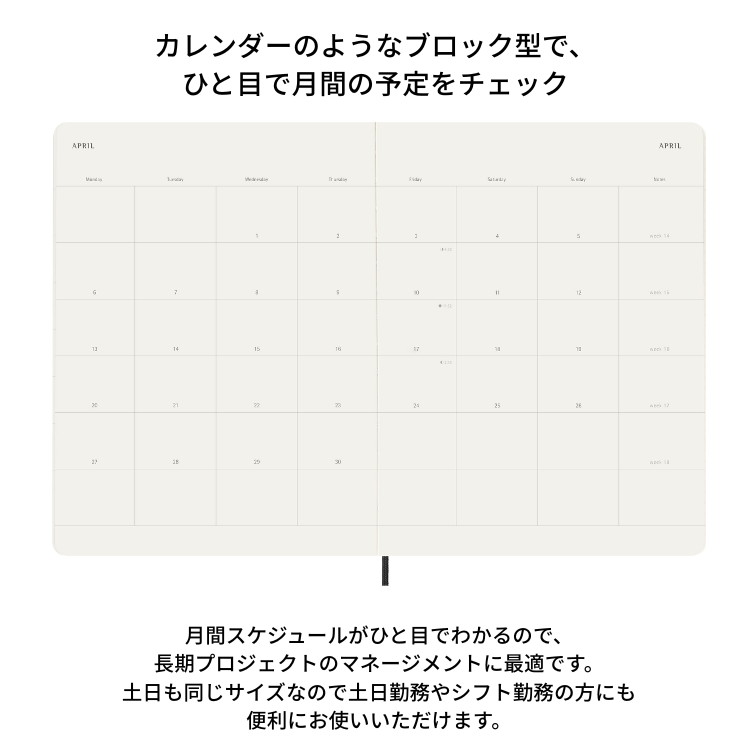 月間スケジュールがひと目でわかるので、長期プロジェクトのマネージメントに最適です。土日も同じサイズなので土日勤務やシフト勤務の方にも便利にお使いいただけます。
