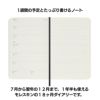 ページを開くと、左に見開き一週間のスケジュール、右は自由に使える横罫ノートになっています。一番下の土日はハーフサイズなので平日のお仕事や学校の予定の書き込みに向いています。