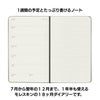 ページを開くと、左に見開き一週間のスケジュール、右は自由に使える横罫ノートになっています。一番下の土日はハーフサイズなので平日のお仕事や学校の予定の書き込みに向いています。