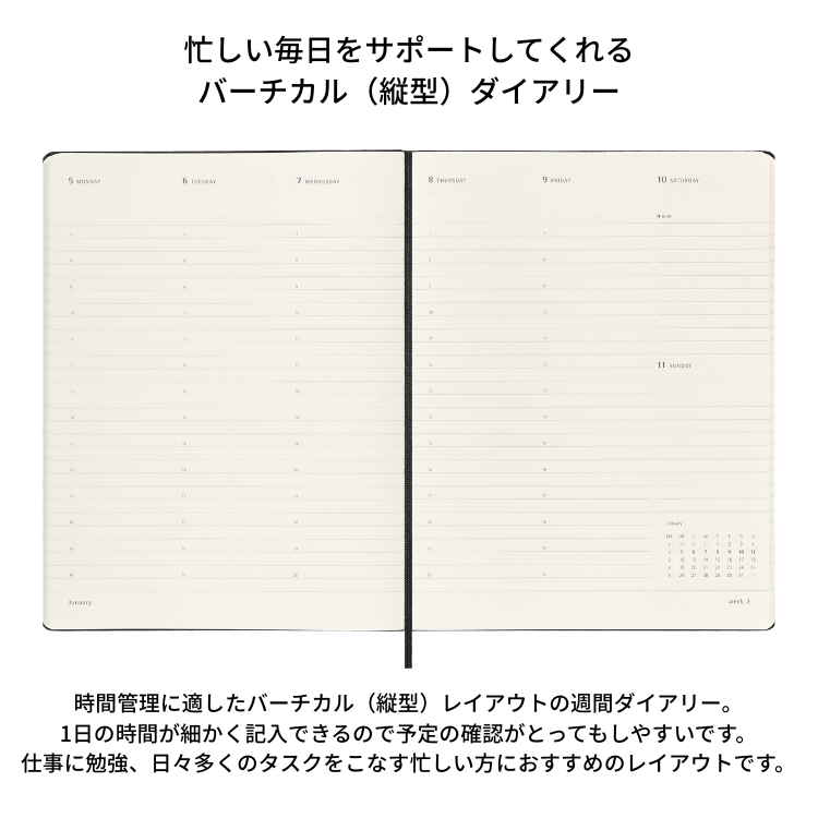 時間管理に適したバーチカル(縦型)レイアウトの週間ダイアリー。1日の時間が細かく記入できるので予定の確認がとってもしやすいです。仕事に勉強、日々多くのタスクをこなす忙しい方におすすめのレイアウトですよ。