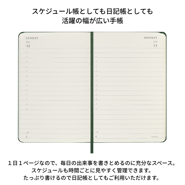 1日1ページなので、毎日の出来事を書きとめるのに充分なスペース。スケジュールも時間ごとに見やすく管理できます。たっぷり書けるので日記帳としてもご利用いただけます。