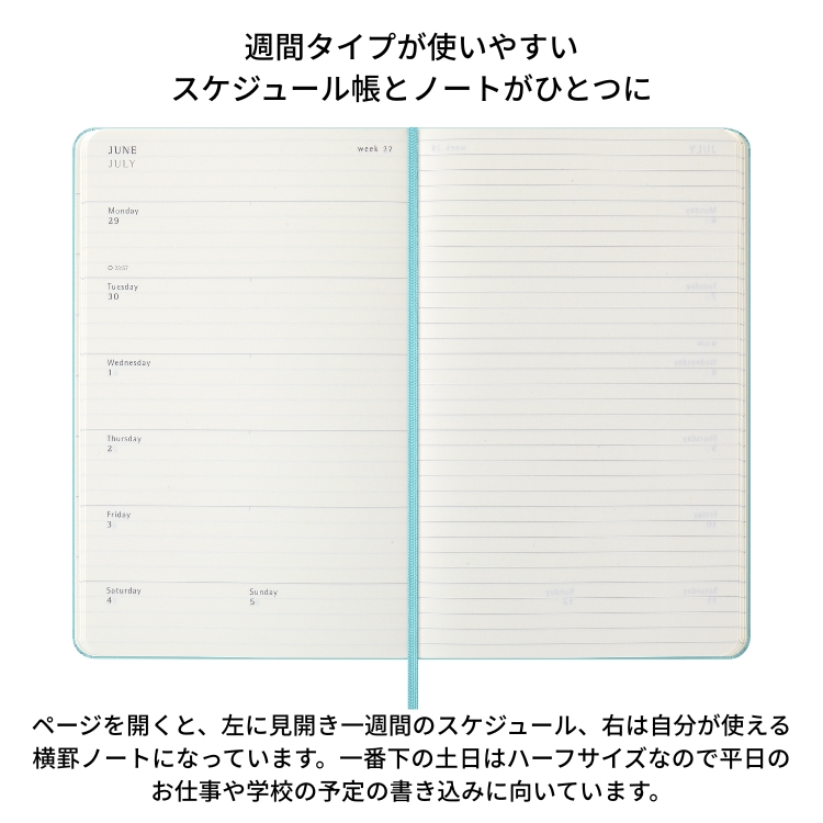 ページを開くと、左に見開き一週間のスケジュール、右は自分が使える横罫ノートになっています。一番下の土日はハーフサイズなので平日のお仕事や学校の予定の書き込みに向いています。