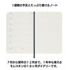 ページを開くと、左に見開き一週間のスケジュール、右は自由に使える横罫ノートになっています。一番下の土日はハーフサイズなので平日のお仕事や学校の予定の書き込みに向いています。