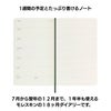 ページを開くと、左に見開き一週間のスケジュール、右は自由に使える横罫ノートになっています。一番下の土日はハーフサイズなので平日のお仕事や学校の予定の書き込みに向いています。