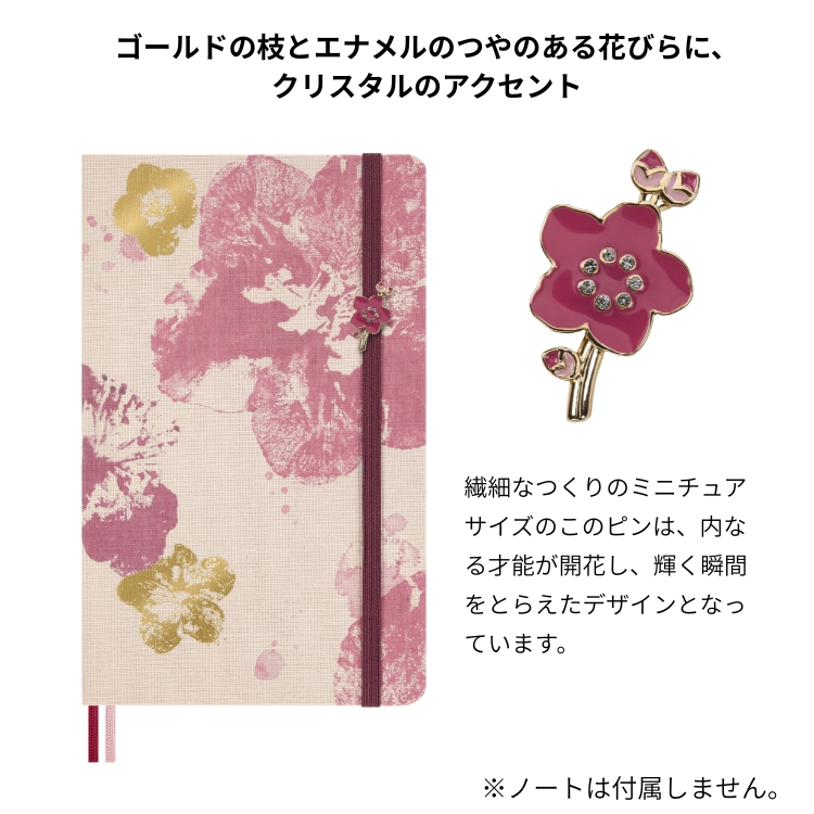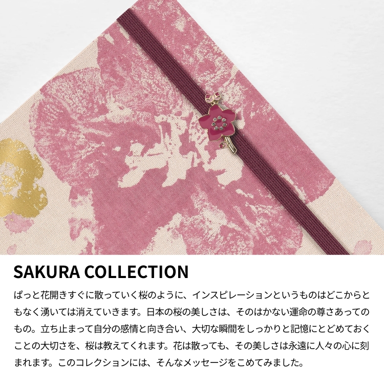日本の伝統技法「魚拓」から着想を得た桜デザインのノート。表紙には桜のプリントとゴールドのデボス加工を施し、自然の姿を紙に写し取る日本の伝統技法「魚拓」から着想を得たデザインに仕上げています。