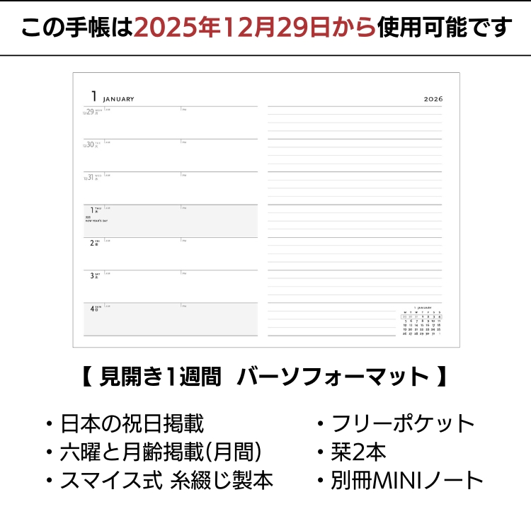 手帳 2026年 ペーパーブランクス ミニサイズ バーソ 見開き1週間 ダイアリー(バンドタイプ)
