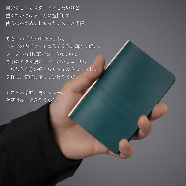 PLOTTER システム手帳カバーに待望のミニ5サイズが仲間入り!イタリア語で「なめらか」という意味を持つ「リスシオ」10世紀以上の歴史を持つ「バケッタ製法」と呼ばれる手鞣し、手染めで仕上げた高級素材の革です。