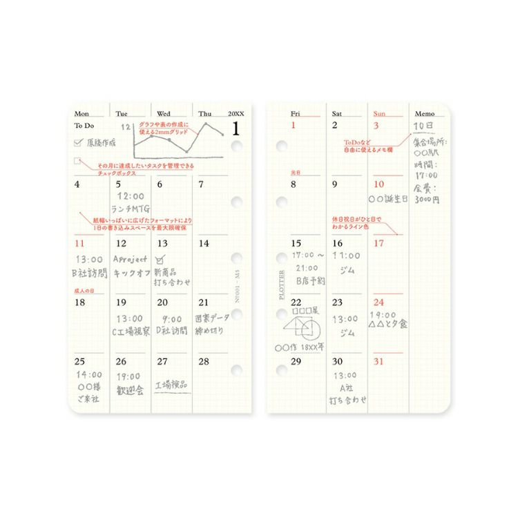 限られたスペースを最大限使えるように緻密に設計された見開きマンスリー薄くてもインクが滲みにくい丈夫な紙と思考の邪魔をしない印刷色が書く人の創造力を働かせ未来を切り拓きます