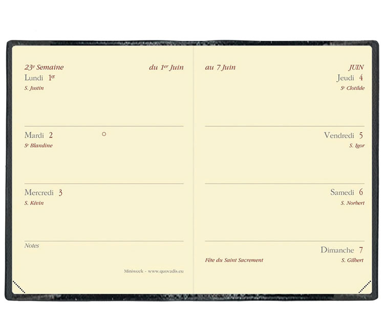 ■ミニウィークの特徴小さなクオバディス。ハンドバッグはもちろん、大きめのペンケースにも収まるかわいいミニダイアリーです。月の満ち欠け・聖人の名前の記載も、フランスならではです。■フランスエディションについてフランスエディションには100%フランス語表記のものと英語併記のものがあります。