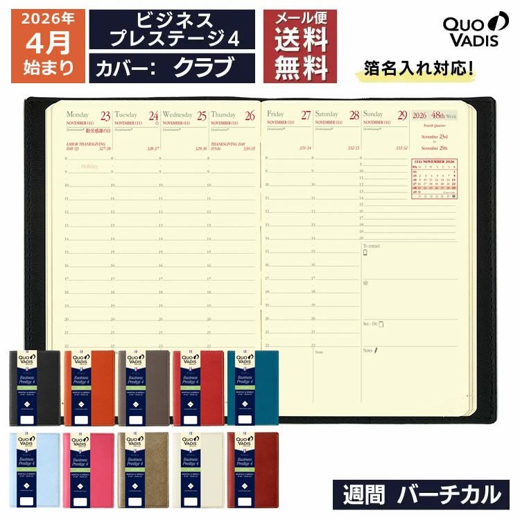 カジュアルでエレガント。手に馴染む小さめサイズカラーが豊富な合皮カバーにステッチがアクセントになっています。小さめサイズなので持ち運び楽々。■ビジネスプレステージ4の特徴日本国内で最も人気があるサイズにエレガントで落ち着いたアイボリーペーパーを使用。曜日ごとのノートスペースが便利なクオバディスダイアリーです。