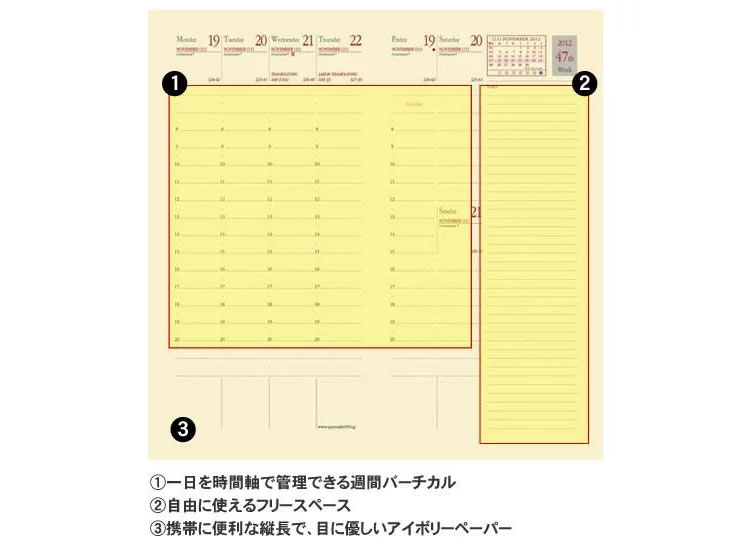 ■プランニング17の特徴携帯に便利なスリムな縦長ダイアリーのバーチカルタイプ。平日の8時前と20時以降、また土日は時間と予定を自由に記入できるようになっており、ONとOFFを1冊でコンパクトに管理できます。