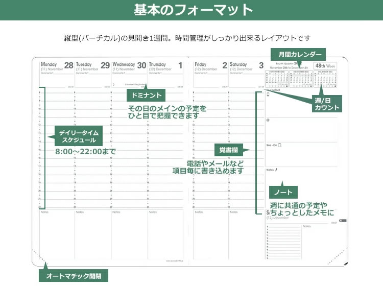 ■トリノートの特徴日ごとのメモ欄が充実し、日本国内で男女間わずビジネスパーソンに人気のサイズ。カバンに納まる日本語版のデスクダイアリーといえば、トリノートです。