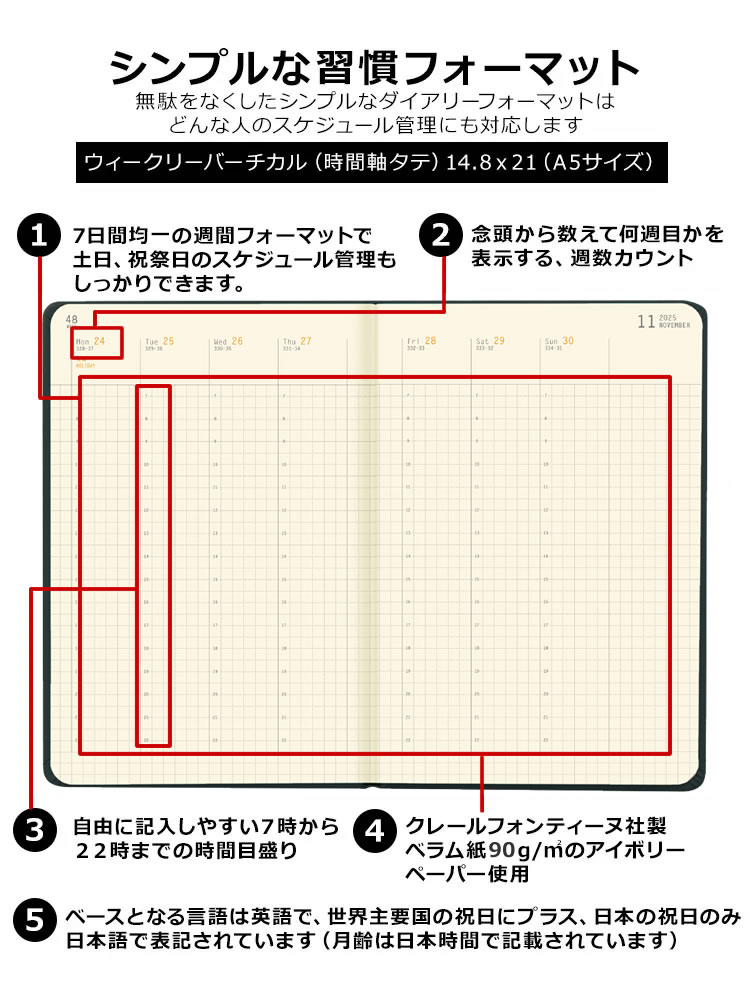 ロディアが提案する、シンプルな手帳世界87カ国以上で愛用されるブロックメモ・ノートを展開してきたロディアが提案するダイアリーWebplanner ウェブプランナーに、ウィークリーバーチカルが仲間入り。縦の時間軸に予定を記入することで、1週間の流れがひと目でわかるフォーマット。5mm方眼のスペースで思考をまとめながら、プランニングが可能です。