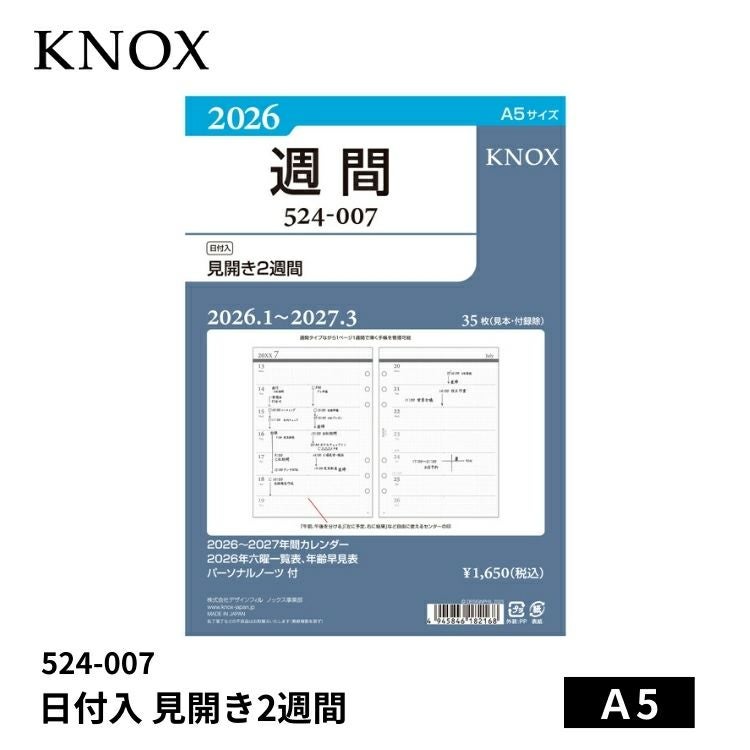 他の画像を見る 【A5】システム手帳リフィル 手帳 2026年 ノックス システム手帳 リフィル 日付入 見開き2週間 A5 524-007 価格 ¥ 1,650 税込 カートに入れる お気に入りに登録する