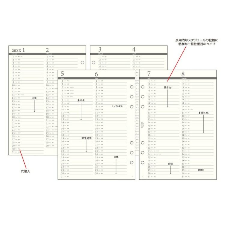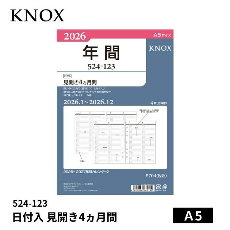 他の画像を見る 【A5】システム手帳リフィル 手帳 2026年 ノックス システム手帳 リフィル 日付入 見開き4ヵ月間 A5 524-123 価格 ¥ 704 税込 カートに入れる お気に入りに登録する