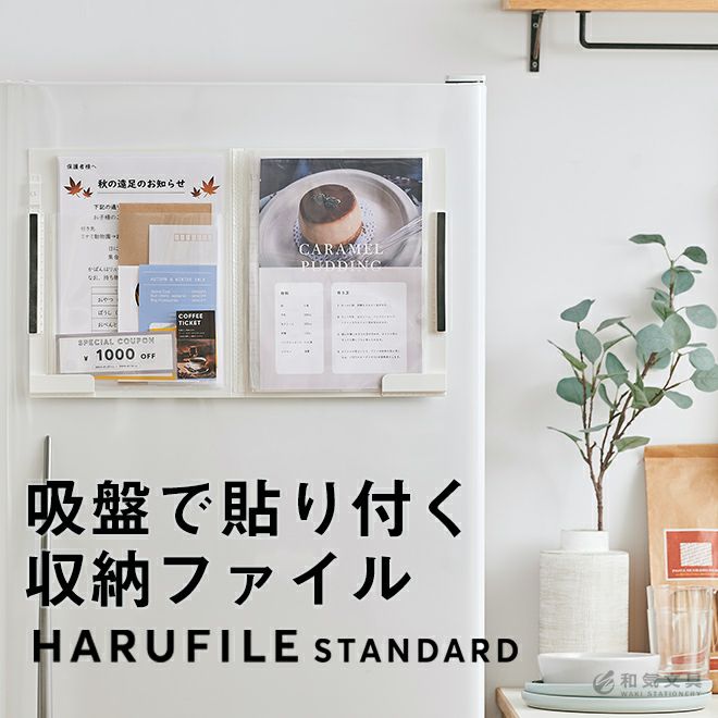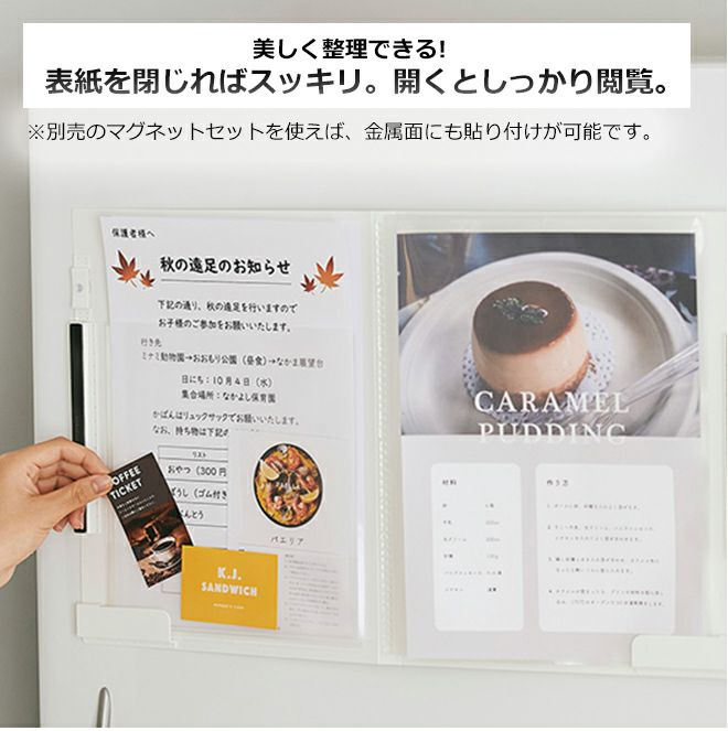 狭い場所にも貼り付けることができるスリムタイプ。表紙を閉じればA4サイズの書類が縦半分にコンパクトにまとまります。