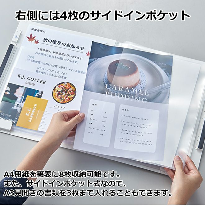 表紙に書類を挟んでおけるクリップタイプ。内側には、A3サイズの書類を見開きで収納することもできます。