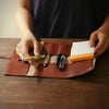 どこに何をいれようかなぁペンケースとして使えるのはもちろん、ツールケースとしても使っていただけます。今回、ロディアNo.11やスマホを収納できる様に作りました。そんな発想でペンケースという枠にとらわれず筆記具以外のアイテムも収納していただけたらと思っています。『どこに何をいれようかなぁ』と考えるのは楽しいですよ。