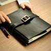 石原10年日記を包み込むビッグサイズの一枚革!迫力に驚かされます。バックルを外す手間も楽しめる存在感です。