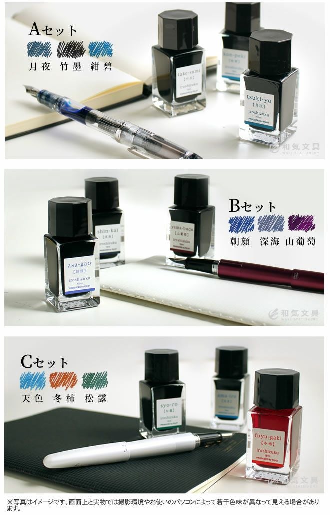 他の画像を見る パイロット 万年筆 インク 色彩雫 ミニ パイロット PILOT 万年筆インキ 色彩雫[いろしずく]iroshizuku mini 3色セット 15ml×3 ◇ 価格 ¥ 3,300 税込 カートに入れる お気に入りに登録する