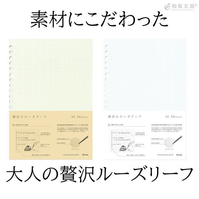 ライフ社の看板製品「ノーブルノート」をkleidが別注しました。ライフ社独自の「Lライティングペーパー」等のクラシカルな魅力に加えて、2mm方眼とクリーム、ホワイトの2色の用紙を採用し、kleidならではの機能的なアレンジを施しました。また、アパレルを想起させるカレッジロゴ調のデザインが唯一無二の存在感を放ちます。