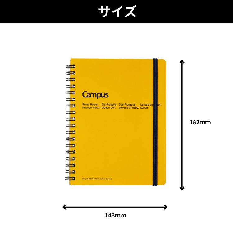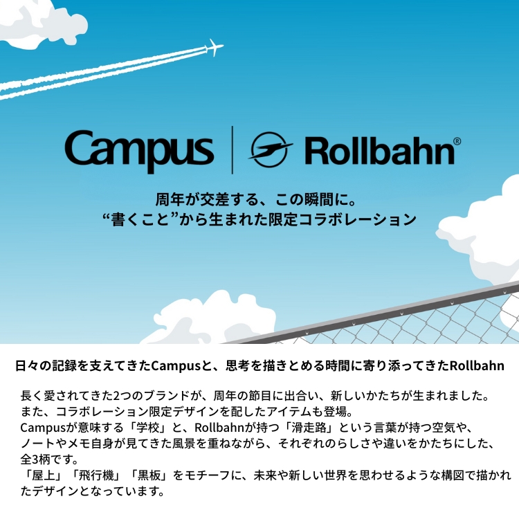 ブランド名のコンセプト(Campus→学校・校舎、Rollbahn→滑走路、飛行機)をモチーフにした限定デザイン。コクヨ独自開発の“新感覚やわらかリング”を採用したリングノートです。