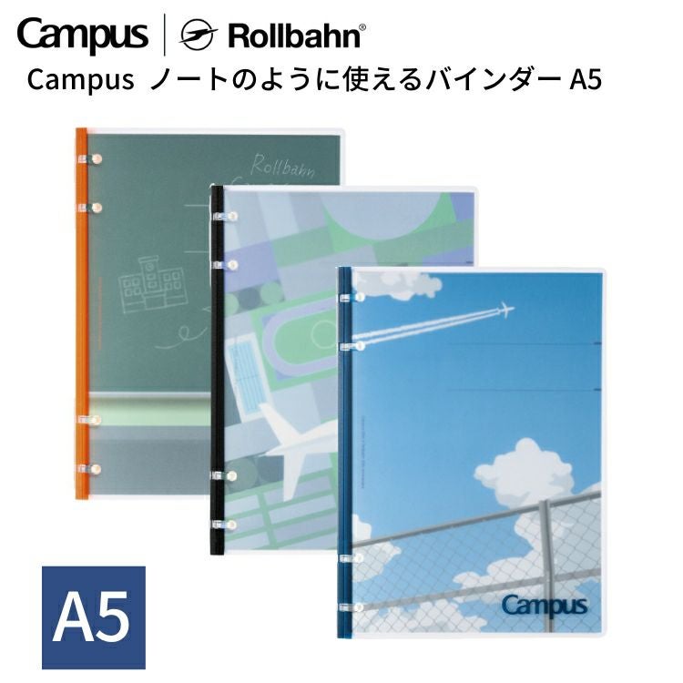ブランド名のコンセプト(Campus→学校・校舎、Rollbahn→滑走路、飛行機)をモチーフにした限定デザイン。コクヨ独自開発の“新感覚やわらかリング”を採用したリングノートです。