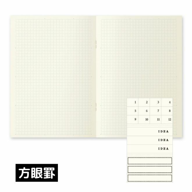 無垢な表紙に似合うインデックスシール付き。「1」~「12」の数字と、使用頻度の高い「IDEA」、枠のみが印刷された自分で記入して使えるインデックスシールが付いています。背の部分などに貼ってお使いください。シールを貼りカスタムすれば、どんなことを記したノートなのか一目でわかるようになります。