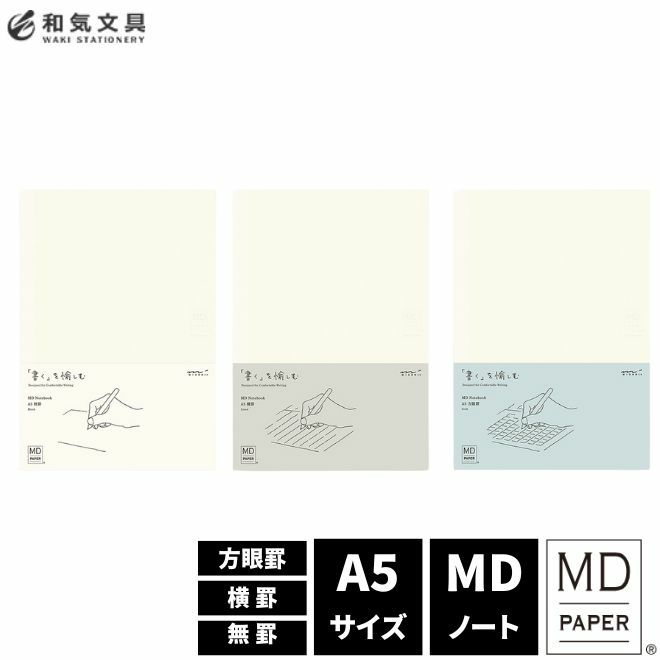 用紙へのこだわりかすかにざらつく「MD用紙」にペン先を滑らせると、そのペン先から小さな音が聞こえてきます。書いている実感を噛みしめられる、そんな絶妙な風合いと、万年筆で書いても裏抜けやにじみがしにくいという品質にこだわって仕上げた1960年代から自社で開発を行い続けてきた究極の紙を使用しています。2023年1月にリニューアルしたMDノート本文だけでなく、表紙や見返しに「MD用紙」を使用して書き心地を極めました。