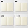 自由なキャンバスの無罫、上下で分けて使える横罫(7mm)、原稿用紙をイメージした方眼罫(5mm)、文字だけでなく図なども添えたいという方におすすめのドット方眼(5mm間隔)の4種類。