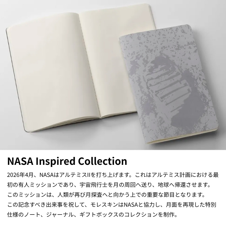 NASAの世界観に着想を得たこの限定版ノート。月面をイメージしたソフトタッチのハードカバーで、NASA-inspiredデザインのギフトボックス付。