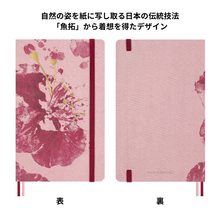 日本の伝統技法「魚拓」から着想を得た桜デザインのノート。表紙には桜のプリントとゴールドのデボス加工を施し、自然の姿を紙に写し取る日本の伝統技法「魚拓」から着想を得たデザインに仕上げています。