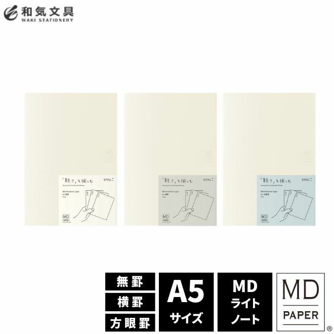 薄くて軽い、A5サイズの『MDノート ライト』「書き心地の良さ」を追求した日本製のノート『MDノート』を薄く持ち歩きやすくした『MDノート ライト』。いつものカバンに忍ばせておき、ちょっとした気づきやひらめきが浮かんだら、さっと取り出して書き留めましょう。ノートに書いたアイデアたちは、後にあなたにとっての宝物となるかもしれません。