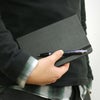 写真の通り、横幅・高さ共にちょうどラージとポケットの間の大きさです。B6変形の手帳などが近い大きさになります。持ち運びも軽やか