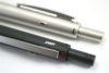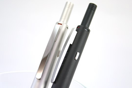 ブラック軸はマットメタル。シルバー軸は鏡面仕上げメタル素材。衣服を傷つけにくいスプリング式のクリップ。胸ポケットに差したときの印象は、高級感があります。