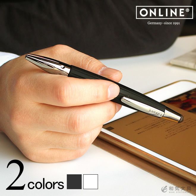 本体上部のクリップ部分には、ブランドロゴ「ONLINE」がさりげなく刻印されています。ワンポイントで主張しすぎない所がオフィス使いに向いていますね。