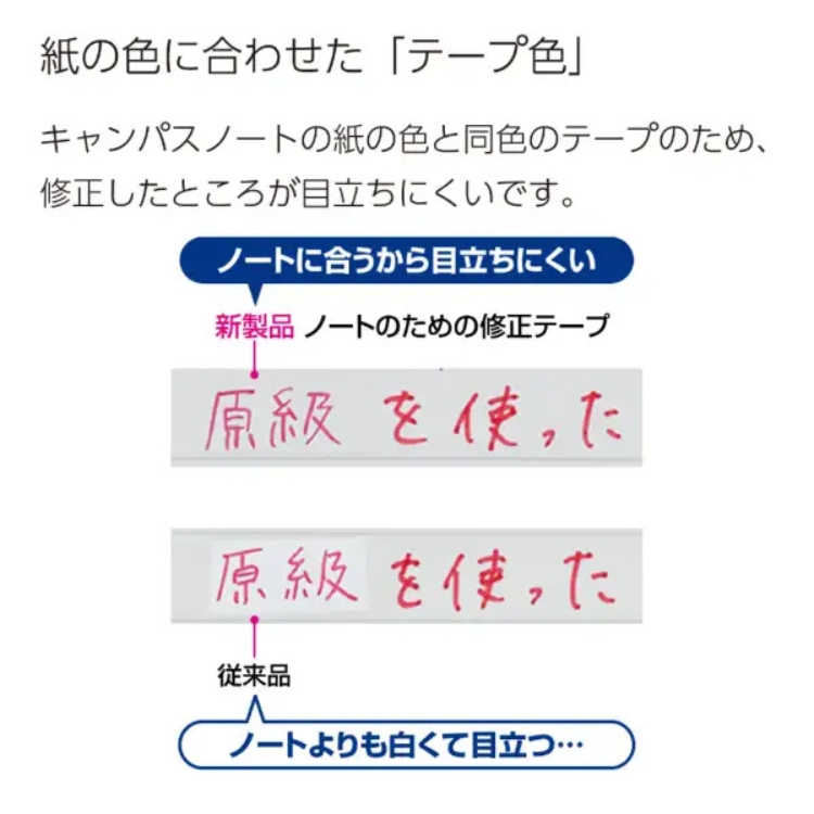 Campusノートの紙の色と同色の修正テープ。ノートの罫幅に合わせたテープ幅のため、ぴったりと修正することができます。