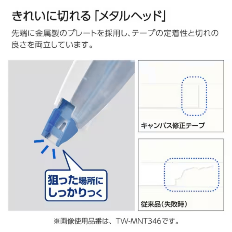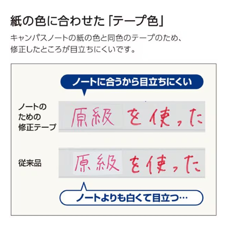 Campusノートの紙の色と同色の修正テープ。ノートの罫幅に合わせたテープ幅のため、ぴったりと修正することができます。