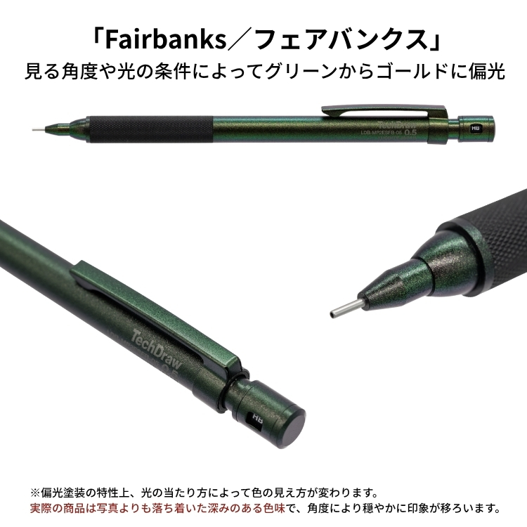 「Ilulissat/イルリサット」ブルーからパープルに、「Fairbanks/フェアバンクス」グリーンからゴールドに見る角度や光の条件によって偏光する美しく、鮮やかなシャープペンシル