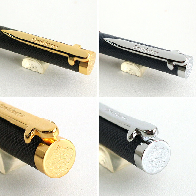 金属部はブラックはゴールド、ネイビーはシルバーに統一されています。どちらも革の色によく合っていて素敵です。替芯で末永くご愛用いただけます天冠・クリップにはロゴが刻印、ブランド感満載の雰囲気です