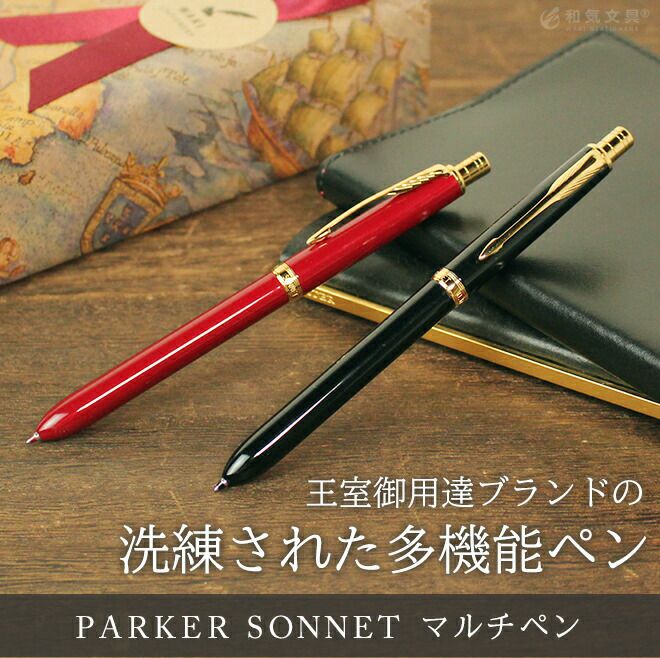 由緒正しい筆記具ブランド、パーカー。その中でも「上品で洗練されたスタイル」をコンセプトにした「SONNET(ソネット)」シリーズのマルチファンクションペンです。1本で3役(ボールペンブラック/レッド/ペンシル0.5mm)をこなす多機能ペンは、ビジネスシーンで活躍します。