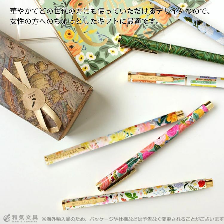 アメリカのブランド「ライフルペーパー」の美しいデザインパターンと、ロゴの刻印があしらわれたボールペンです。ライフルペーパーの創業者であり、アーティストのアンナ・ボンドが水彩で描くカラフルで繊細なハンドタッチのフラワー&ボタニカルデザインが、使う人の手もとを華やかに彩ります。女性へのギフトにオススメです。