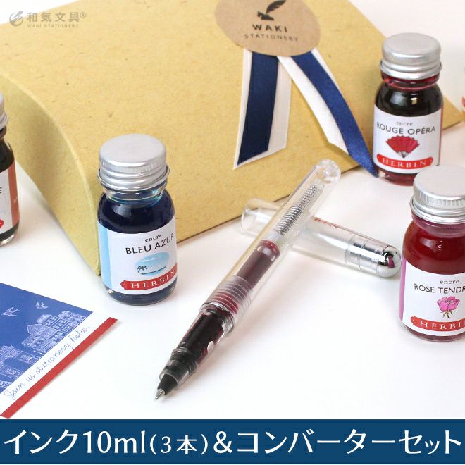 フランスで350年の歴史を誇る、エルバン。バリエーション豊かで美しいカラーインクが人気です。そんなエルバンのカラーインクを、透明軸のコンバーター付きローラーボールペンとのセットでご用意しました。