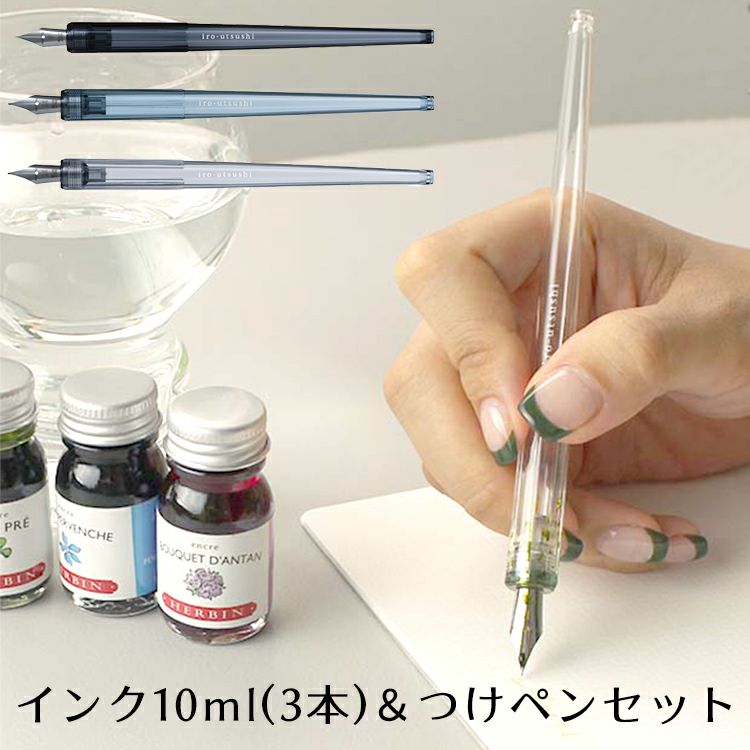 ペン先を万年筆用インクに浸しながら筆記する、つけペンタイプの筆記具「iro-utsushi いろうつし」が登場!和気文具では、届いたその日からすぐにカラフルなインクを存分に楽しんでいただけるよう、フランスの老舗ブランド「エルバン」のかわいらしい10mlミニボトルインクが3本付いた特別セットをご用意しました!
