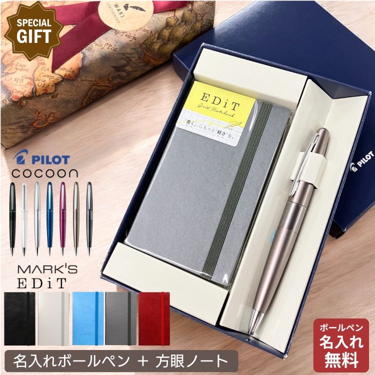薄くて軽く、書き心地がなめらかなマークスの手帳用紙を使用した小さな方眼ノート「EDiTノート」と繭のように滑らかなフォルムが手に馴染む「パイロットのCOCOONボールペン」をギフトセットにしました。