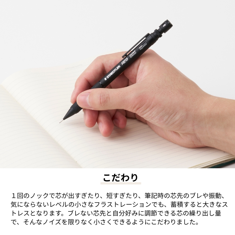 ノック一回分の芯を繰り出し量を、好みの長さに調整できるシャープペンシルです。